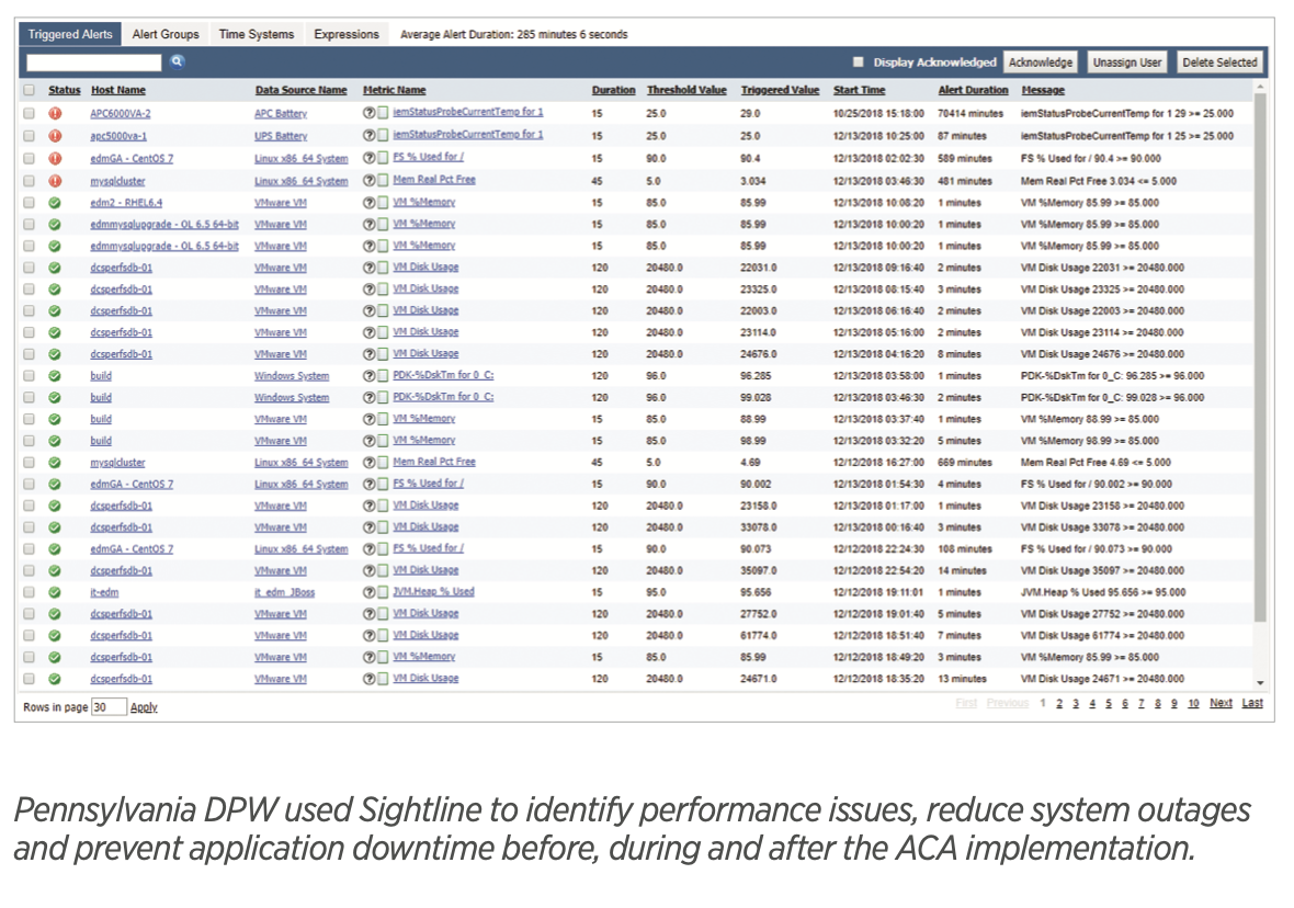 Dans le Commonwealth de Pennsylvanie, le Department of Public Welfare (DPW) - aujourd'hui connu sous le nom de Department of Human Services (DHS) - a été confronté à la tâche critique de gérer le déploiement de son échange d'assurance santé dans le cadre de la loi sur les soins abordables (Affordable Care Act). Pour garantir une expérience transparente et fiable aux citoyens, le DPW a choisi la solution d'analyse des performances informatiques de Sightline, Sightline EDM™Il s'agit d'identifier de manière proactive les problèmes de performance potentiels grâce à la détection d'anomalies et de prévenir les pannes de système.